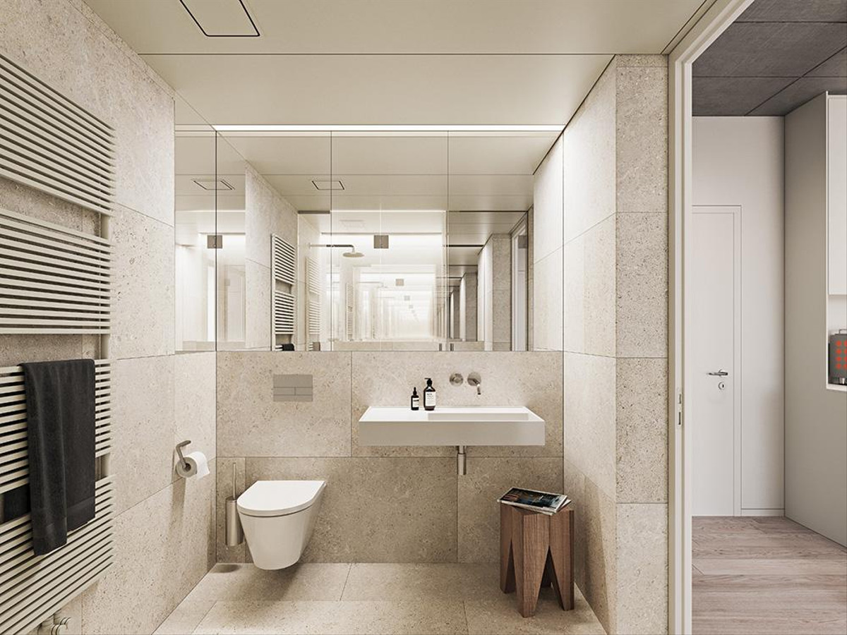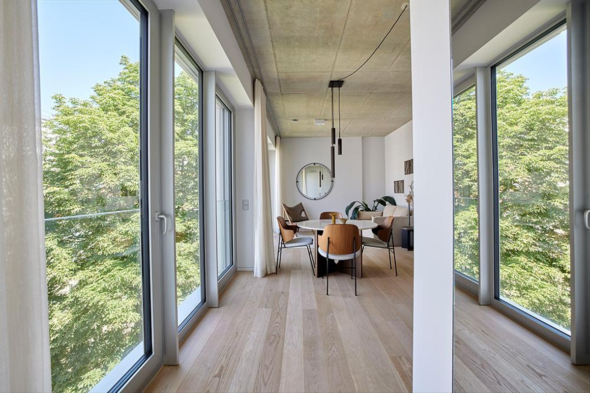 Sichtbetonwände und helles Echtholzparkett, raumhohe Fenster und großzügige Loggien prägen den besonderen Raumeindruck. Mit den von Grüntuch Ernst ausgewählten Ausstattungen und Materialien der besten verfügbaren europäischen Manufakturen ergibt sich eine puristische Eleganz.