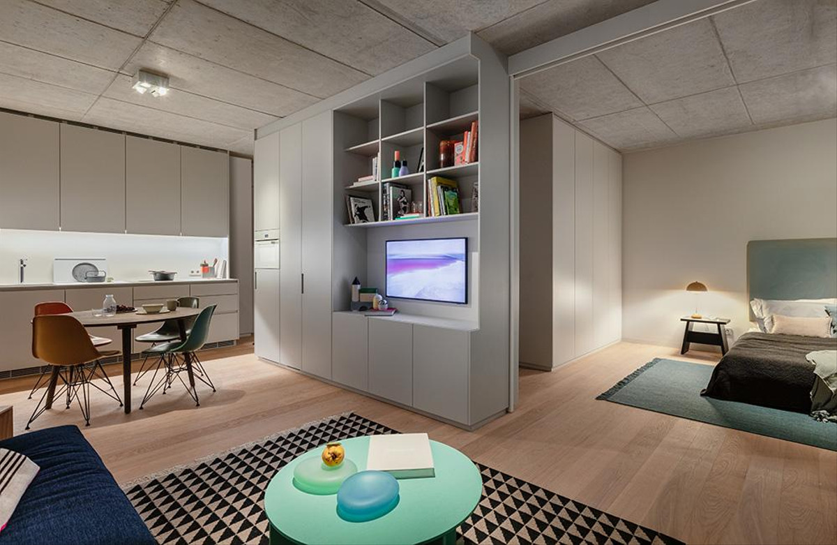 Der Design-Anspruch von Grüntuch Ernst Architekten verleiht den SUITES AM TACHELES ein neues, radikales Bekenntnis zu Minimalismus und Ästhetik. Die klug geschnittenen Minimal Design Suites mit ein bis drei Zimmern und Wohnflächen von 41 bis 73 m² sind durch den Einsatz eines Raumteilermöbels und einer Manufaktur-Einbauküche perfekt aufgeteilt.
