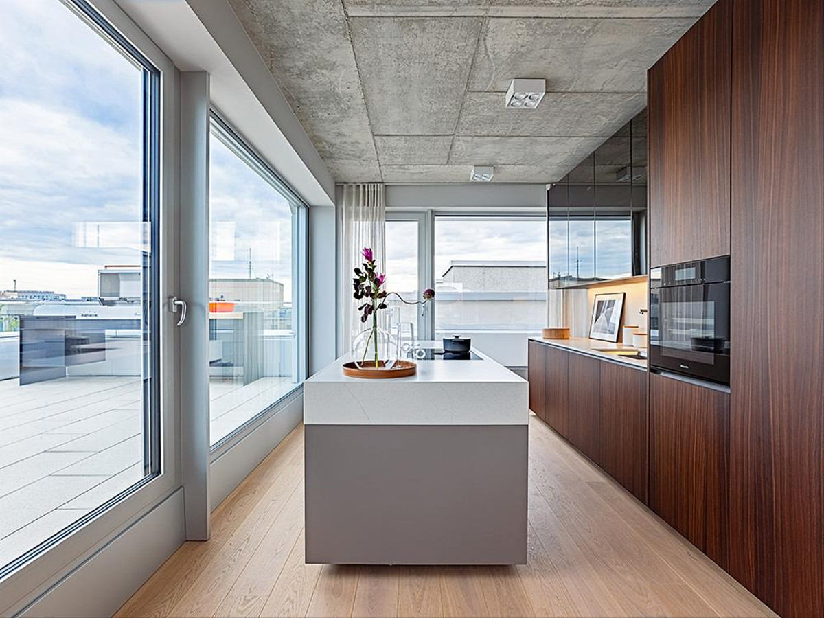 Die Krönung des Projektes bilden zweifelsohne die beiden Penthouses. Mit Wohnflächen von 164 bzw. 201 m² bieten sie ein Wohnambiente, das in seiner Exklusivität und seinem Design über den Dächern der Stadt seinesgleichen sucht. Fernsehturmblick inklusive.