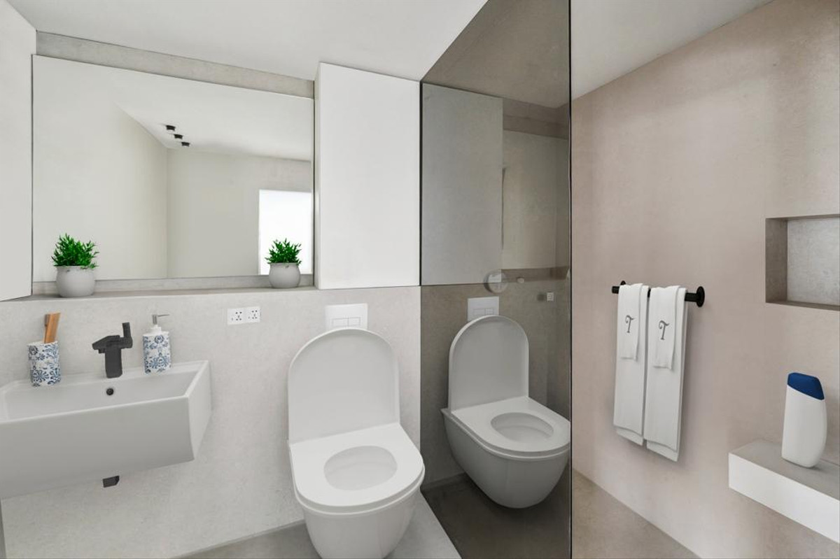 Das moderne Badezimmer ist ausgestattet mit einer bodengleichen Dusche, großformatigen Fliesen und eleganten Armaturen. Ein praktischer Abstellraum innerhalb der Wohnung sorgt für zusätzlichen Stauraum – besonders wertvoll im Penthousebereich.