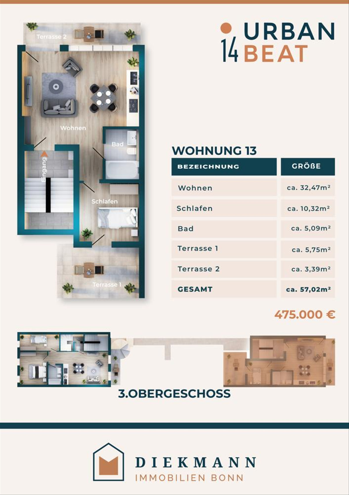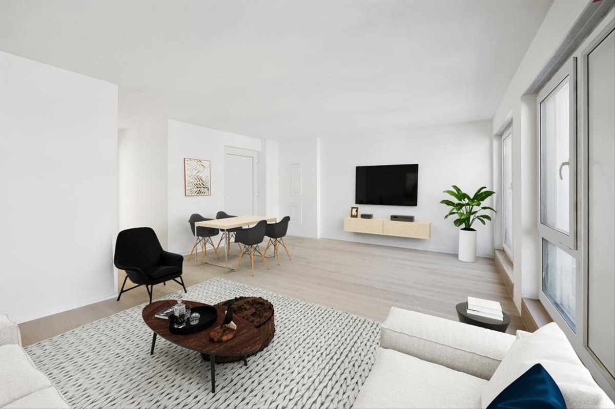 Der Wohn-Essbereich mit offener Küche ist großzügig geschnitten und wird durch bodentiefe Fensterflächen mit Tageslicht durchflutet. Das Schlafzimmer liegt zur ruhigen Rückseite des Hauses und bietet direkten Zugang zur Dachterrasse – ideal für den ersten Kaffee am Morgen unter freiem Himmel.