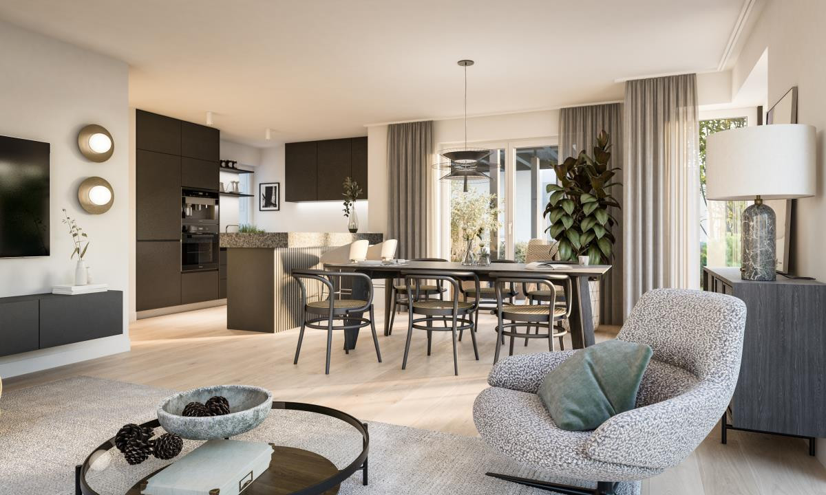 › Lichtdurchflutete Wohn-Ess-Bereiche mit integrierten Küchen.
