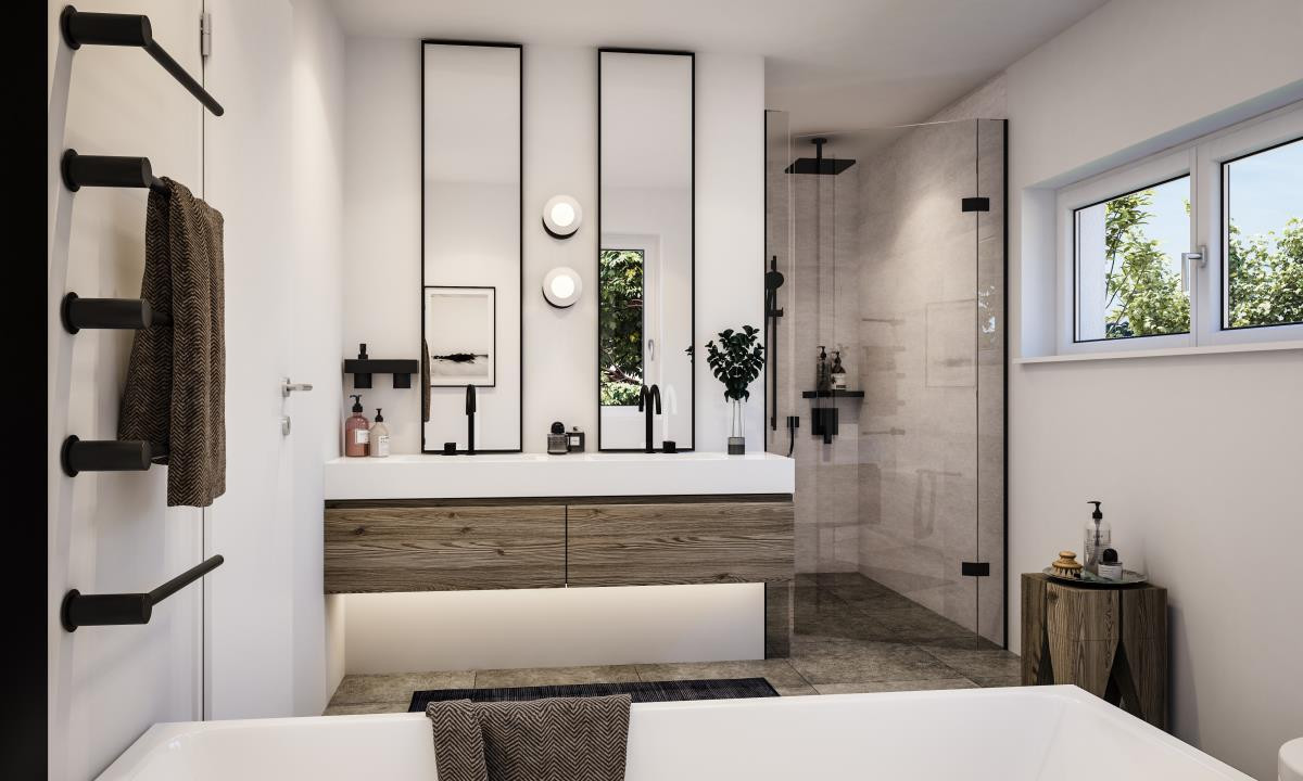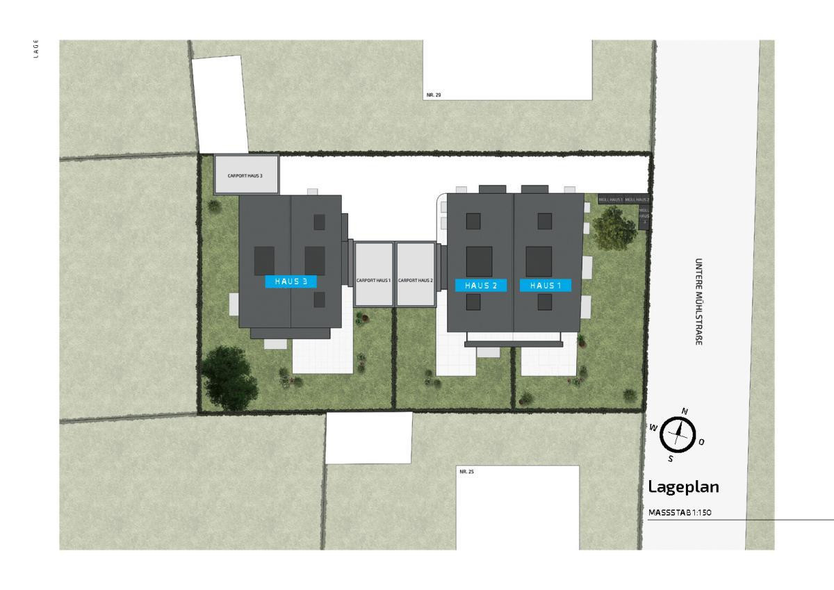 In den Ober- und Dachgeschossen der Häuser befinden sich gut geschnittene Räume zum Entspannen, Spielen oder Arbeiten. Moderne Tageslichtbäder mit bodengleichen Duschen, Wannen und edlem Markensanitär lassen keine Wünsche offen und sorgen für kleine Auszeiten vom Alltag. Weiteren Raum für die Dinge des Lebens bieten die Untergeschosse, für Pkw stehen drei überdachte Carports auf dem Grundstück bereit.
