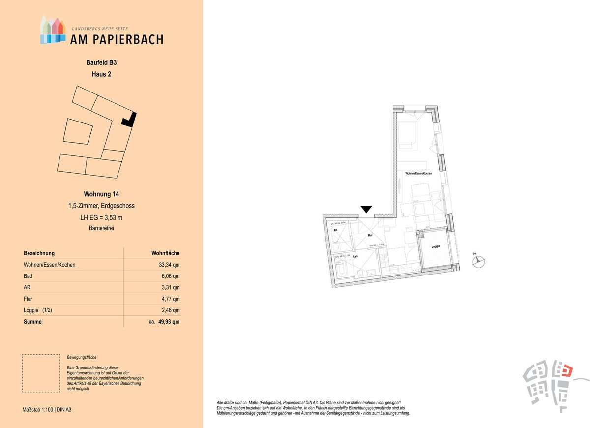 Als eines von zwei Wohngebäuden "Am Papierbach" bietet der neue Bauabschnitt exklusive Blicke über den Lech bis in die Altstadt. Durch die prominente Lage erreichen Sie über den Lady-Herkomer-Steg in wenigen Minuten die Landsberger Altstadt oder das Zentrum des Quartiers.