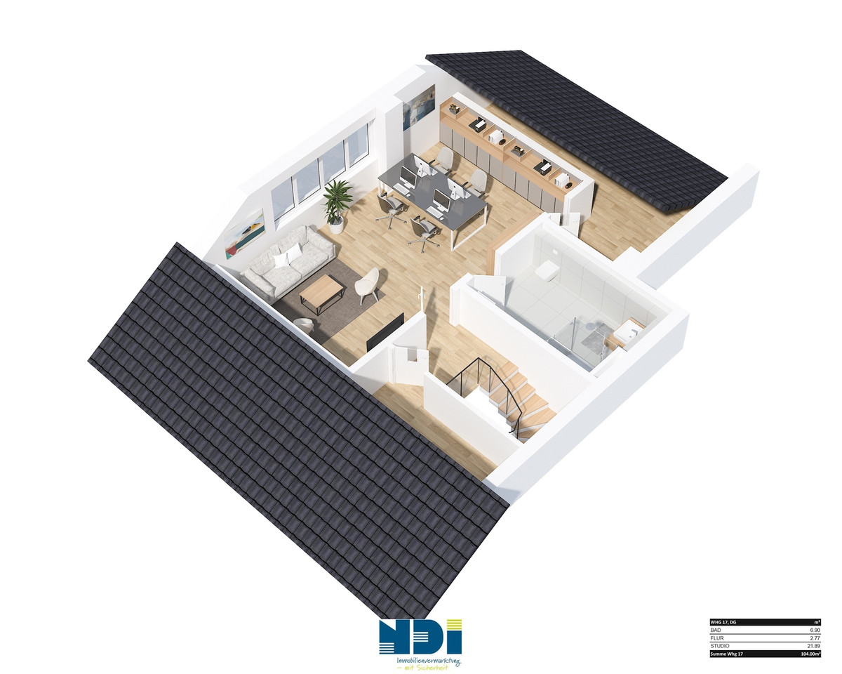 Über eine Treppe gelangen Sie auf die zweite Ebene dieser Wohnung im Dachgeschoss, hier befindet sich ein riesiges Studio mit ganz viel Licht, perfekt als Zimmer für Jugendliche oder als Arbeits/Gästezimmer.