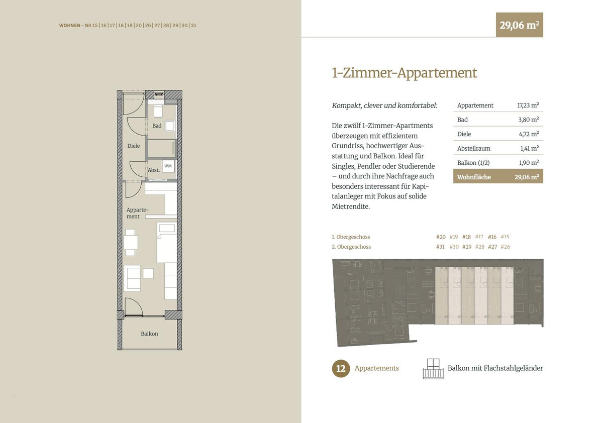 Alle Einheiten überzeugen durch eine moderne Ausstattung und eine harmonische Material- und Farbwelt mit hellen, natürlichen Tönen und stilvollen Details wie Flachstahlgeländern. Hochwertige Bäder, Echtholzparkett, elektrische Rollläden sowie praktische Abstellräume unterstreichen den hohen Qualitätsanspruch des renommierten Bauträgers.