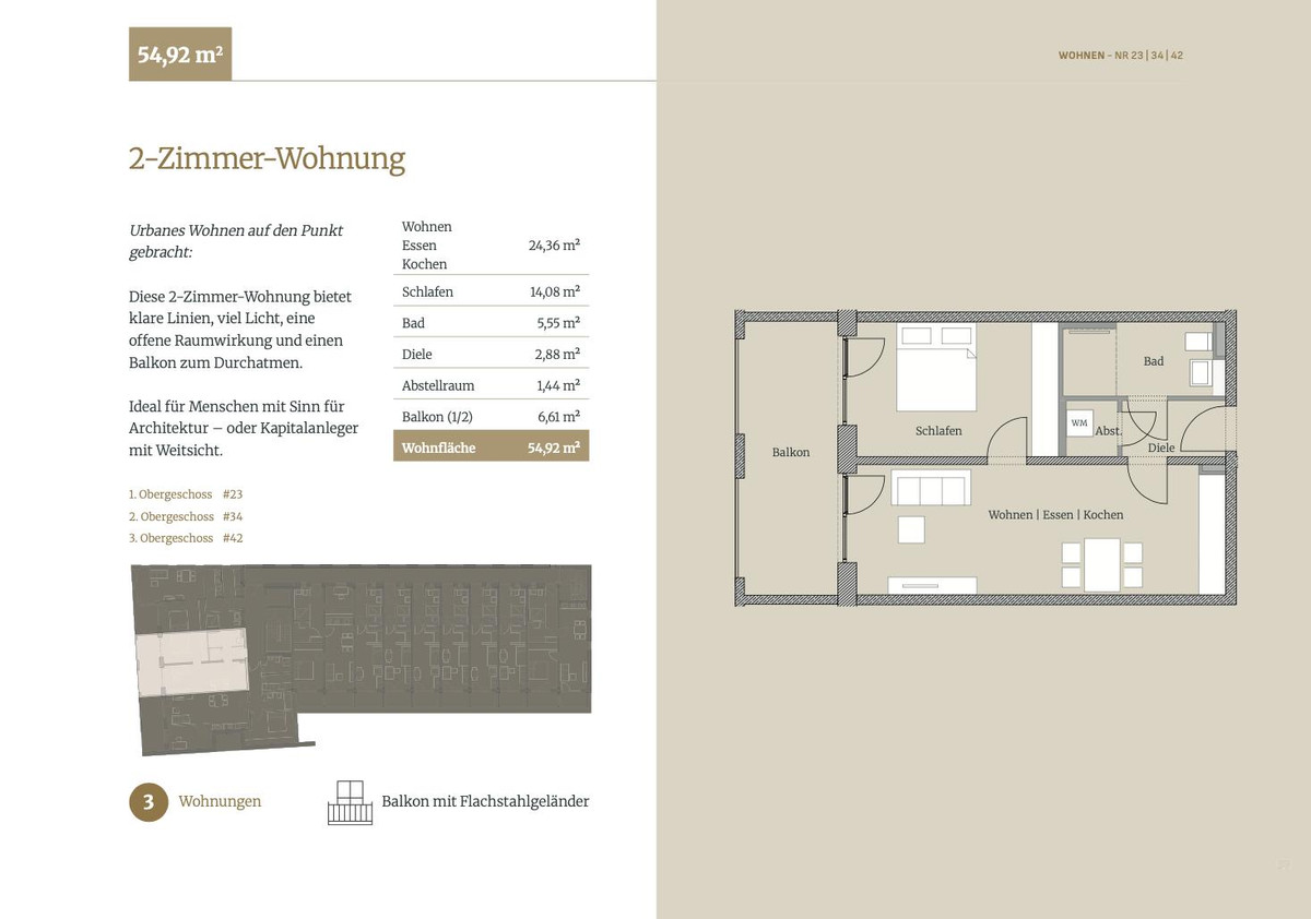Alle Einheiten überzeugen durch eine moderne Ausstattung und eine harmonische Material- und Farbwelt mit hellen, natürlichen Tönen und stilvollen Details wie Flachstahlgeländern. Hochwertige Bäder, Echtholzparkett, elektrische Rollläden sowie praktische Abstellräume unterstreichen den hohen Qualitätsanspruch des renommierten Bauträgers.