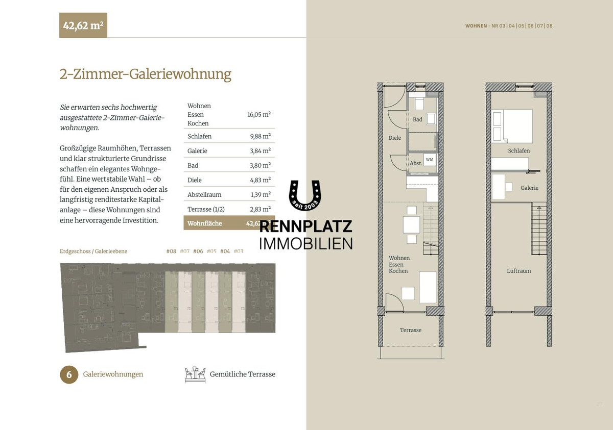 Die Gebäudeplanung legt besonderen Wert auf ästhetisches Design und funktionale Raumkonzepte. Großzügige Fensterflächen, charmante Loggien sowie helle Galeriewohnungen im Erdgeschoss mit Terrassen schaffen ein offenes, lichtdurchflutetes Wohlgefühl.