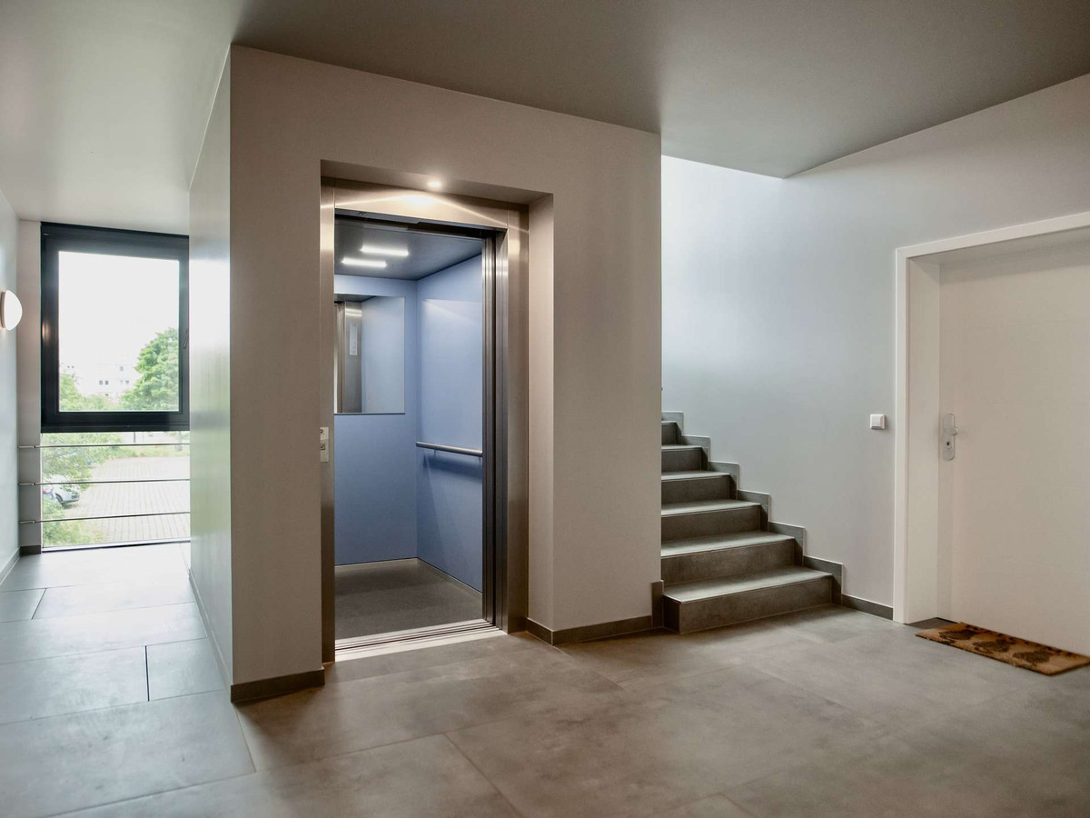 Sie erreichen Ihre neue Traumwohnung ebenerdig mit einem Lift der Schweizer Firma Schindler. Bereits beim Betreten entsteht eine wohlige Atmosphäre durch lichtdurchflutete Räume mit bodentiefen Fenstern und einem hochwertigen Holzboden.