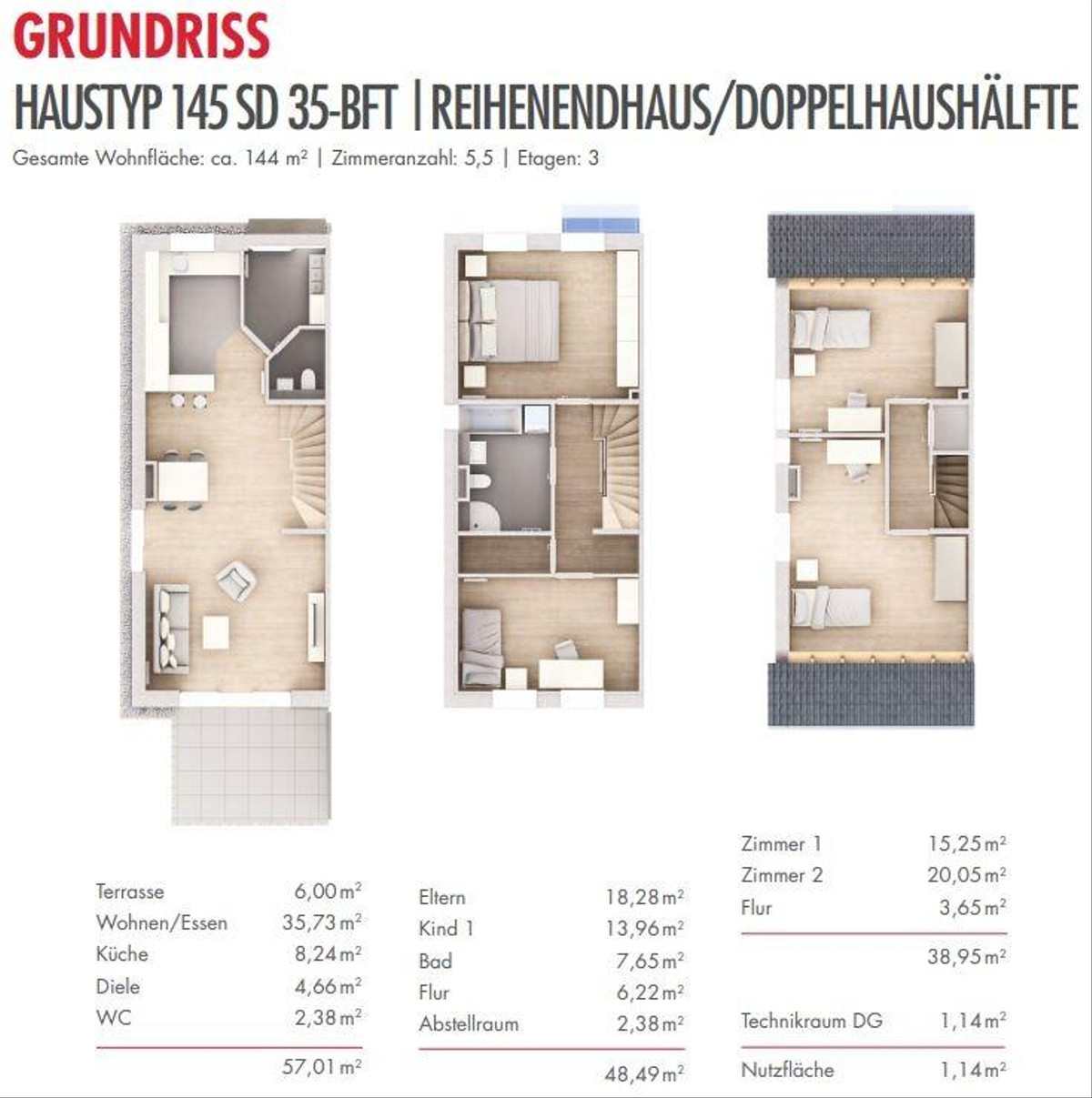Die durchdachten Grundrisse erstrecken sich über drei Etagen und schaffen großzügige, lichtdurchflutete Wohnräume. Eine einladende Terrasse und ein eigener Gartenbereich bieten zusätzlichen Raum für Entspannung und Familienleben.